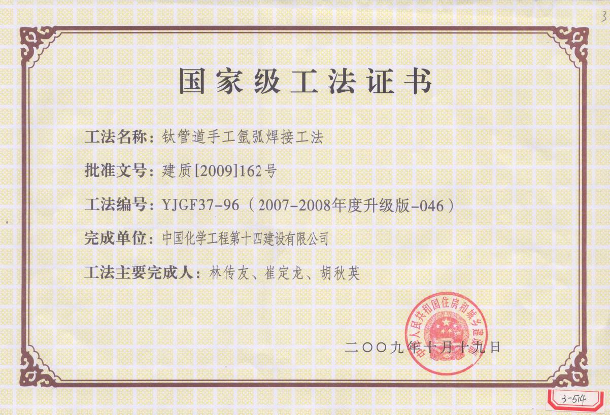 鈦管道手工氬弧焊工法(國家級)-中國化學(xué)工程第十四建設有限公司