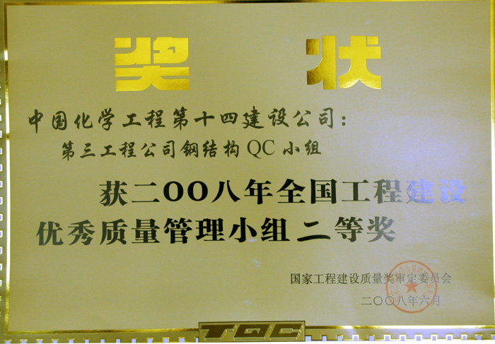 2008年全國工程建設優(yōu)秀質(zhì)量管理小組二等獎-中國化學(xué)工程第十四建設有限公司