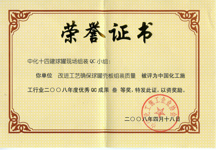 中國化工施工行業(yè)2008年度優(yōu)秀QC成果三等獎-中國化學(xué)工程第十四建設有限公司