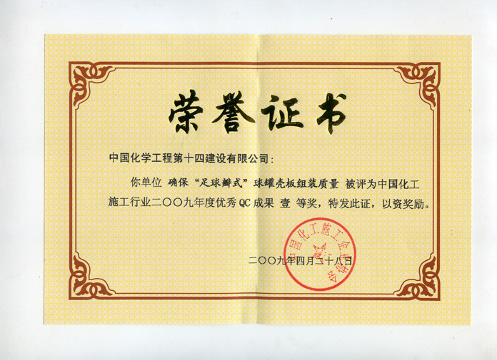 中國化工施工行業(yè)2009年度優(yōu)秀QC成果一等獎-中國化學(xué)工程第十四建設有限公司