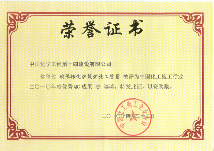 中國化工施工行業(yè)2010年度優(yōu)秀QC成果一等獎-中國化學(xué)工程第十四建設有限公司