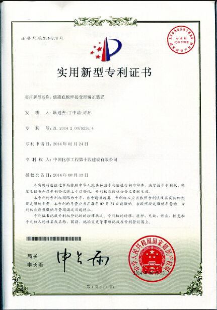 實(shí)用新型專(zhuān)利證書(shū)--儲罐底板焊接變形矯正裝置-中國化學(xué)工程第十四建設有限公司