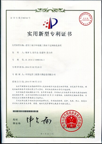 實(shí)用新型專(zhuān)利證書(shū)--適用于城市環(huán)境施工的水平定向鉆孔系統-中國化學(xué)工程第十四建設有限公司