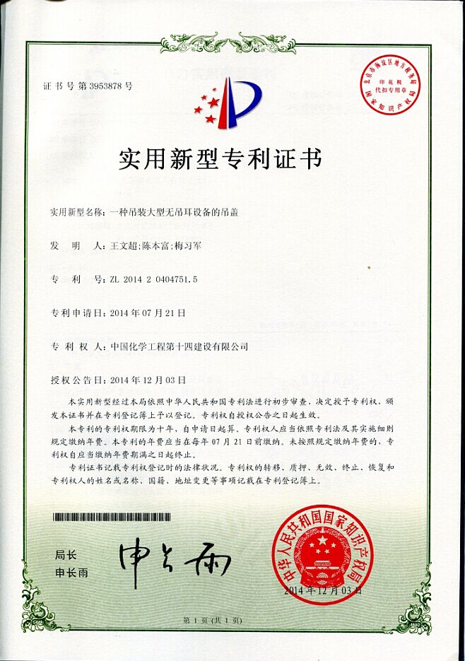 實(shí)用新型專(zhuān)利證書(shū)--一種吊裝大型無(wú)吊耳設備的吊蓋-中國化學(xué)工程第十四建設有限公司