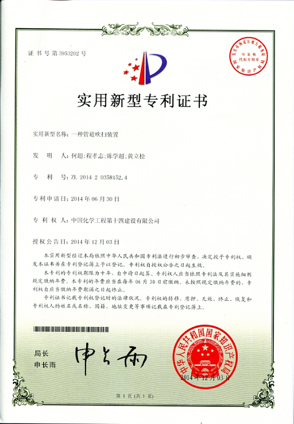 實(shí)用新型專(zhuān)利證書(shū)--一種管道吹掃裝置-中國化學(xué)工程第十四建設有限公司