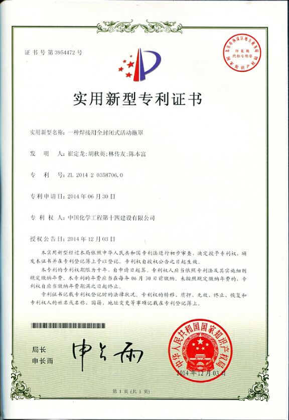 實(shí)用新型專(zhuān)利證書(shū)--一種焊接用全封閉式活動(dòng)拖罩-中國化學(xué)工程第十四建設有限公司