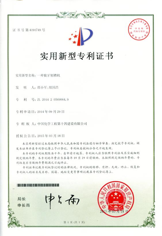 實(shí)用新型專(zhuān)利證書(shū)——一種狼牙刨槽機-中國化學(xué)工程第十四建設有限公司
