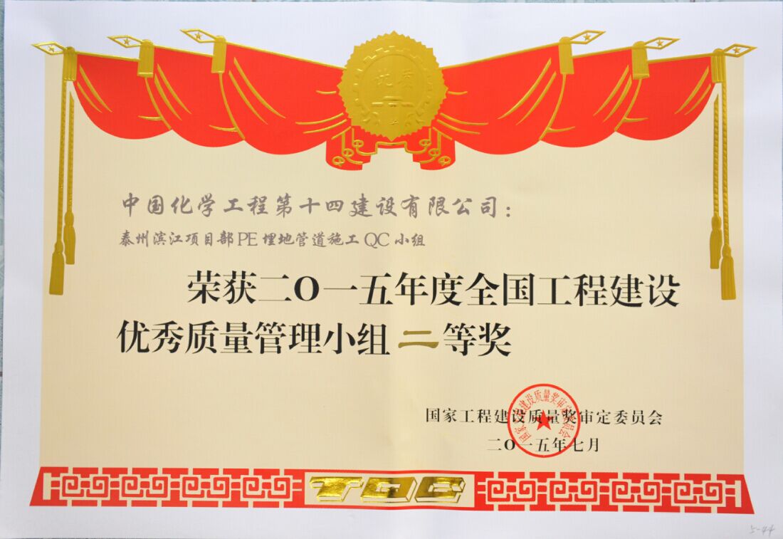 全國工程建設優(yōu)秀質(zhì)量管理小組二等獎-中國化學(xué)工程第十四建設有限公司