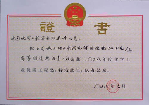 化學(xué)工業(yè)優(yōu)秀工程獎(山東濱化濱陽(yáng)燃化瀝青工程)-中國化學(xué)工程第十四建設有限公司