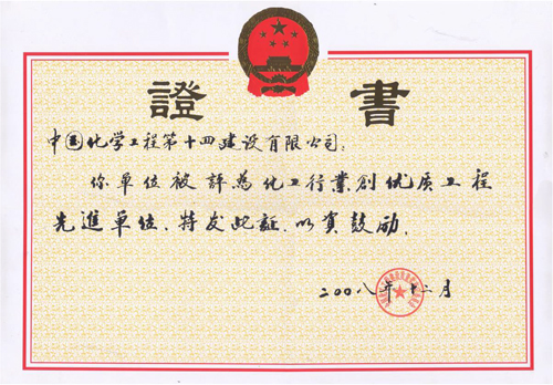 化工行業(yè)創(chuàng )優(yōu)質(zhì)工程先進(jìn)單位-中國化學(xué)工程第十四建設有限公司