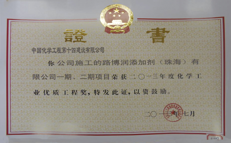 化學(xué)工業(yè)優(yōu)質(zhì)工程獎——路博潤添加劑(珠海)有限公司一期、二期項目-中國化學(xué)工程第十四建設有限公司